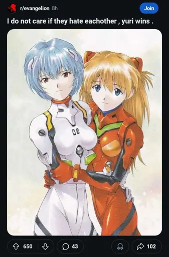 tgirlschierke@lemmy.blahaj.zoneEnglish · 4 days agoAsurei's Strongest Soldier [Neon Genesis Evangelion]lemmy.blahaj.zoneimagemessage-square2linkfedilinkarrow-up171arrow-down14
