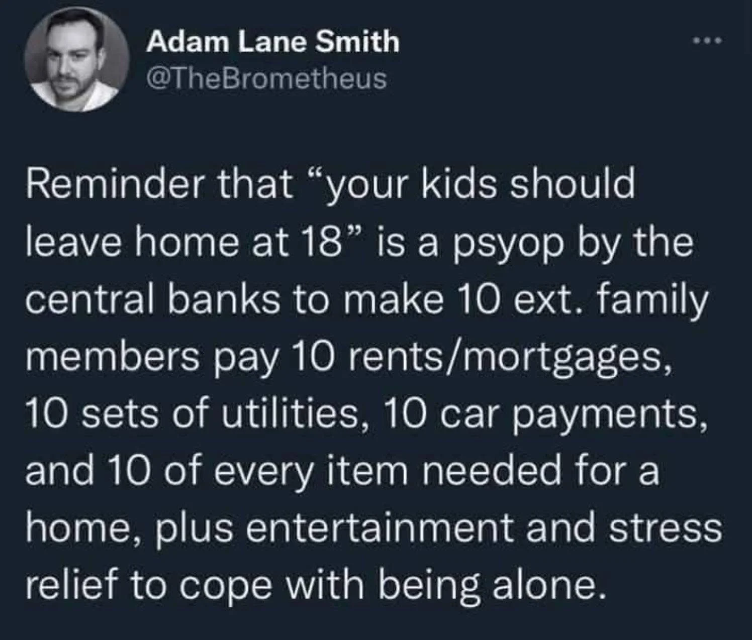 Or is it just not enough that the cost of living is going up every year to have a reasonable argument to remain home with family- now it has to be a “psyop” by big banking.