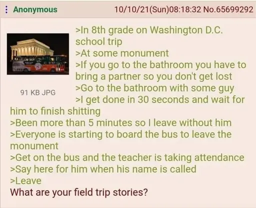 I have an 8th grade DC trip story myself, actually. We were at one of those colonial reenactment places where everything is brown and people dress like it’s the 18th century. It was alright.
