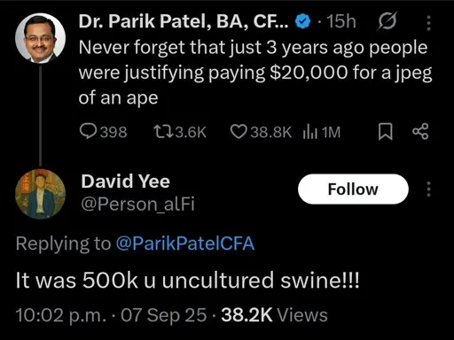 People are still paying over 100k for a bitcoin. Which in my opinion, is equally absurd and doomed to fail. Like yea, if you bought one for 2 dollars and turned it into 100k you won investing and maybe established generational wealth. But the same could be said if you managed to catch the windfall of NFTs, it doesn’t change the fact that it’s stupid to assign billions of dollars in value to a global game of guess the number.