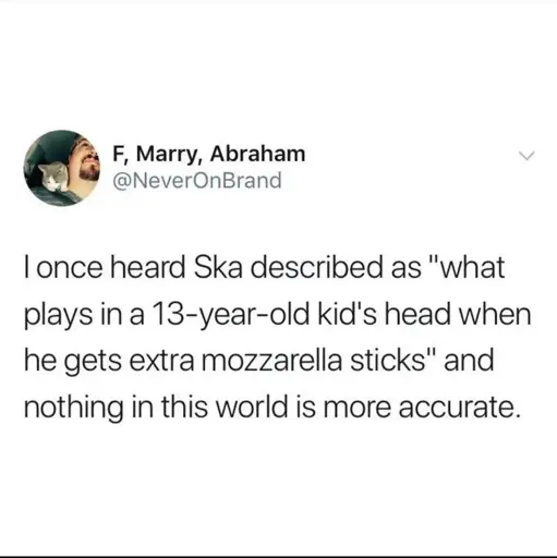 arrow-up1706arrow-down1imageSka still slaps thoughlemmy.dbzer0.comStamets@lemmy.dbzer0.com to People Twitter@sh.itjust.works · 15 days agomessage-square87linkfedilink
