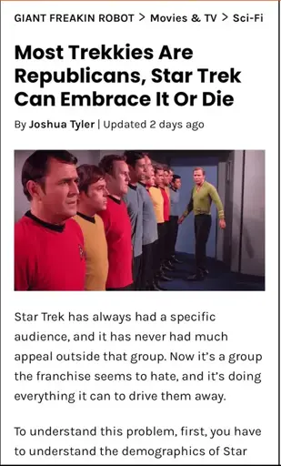No idea what the comment said, but yes, modern star trek does push a narrative… selectively. Like, at the start of Disco, they got it perfect. Gay engineer, gay doctor. No big focus, no “OMG, YOURE GAY???”. They were just there. Doing their jobs. It was, for lack of a better word, normal.